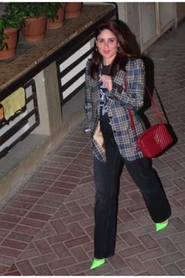 Kareena looked dapper in checkered blazer and trousers as she smiled with all her heart for the cameras. In a black graphic printed T-shirt, Kareena added a blue and white checkered blazer and a pair of black denims, as she posed for the cameras.
